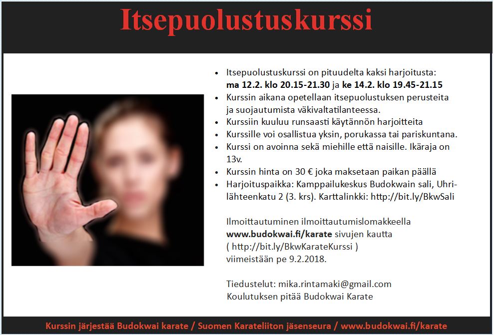 Budokwai karate järjestää kahden harjoituskerran itsepuolustuskurssin viikolla 7, ma 12.2. ja ke 14.2.2018. Lisätietoja ja ilmoittautuminen näiden sivujen kautta.