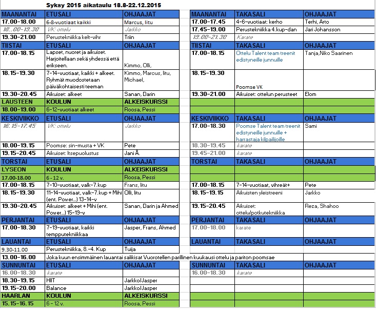 Kokosivun versio kalenterista. Harjoitusajat löytyvät myös iCal muodossa jonka pystyt kopiomaan omaan sähköiseen kalenteriisi. Aikataulu löytyy myös taulukkolaskenta muodossa.