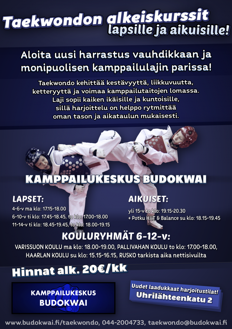 Alkeiskurssit alkavat kaikissa ikäryhmissä jokaisella toimipisteellä Lasten ja aikuisten alkeiskurssit käynnistyvät 1.9! Ryhmiin voi tulla mukaan missä vaiheessa kautta tahansa vaikka ensimmäisiin harjoituksiin ei ehtisikään. Meillä voit kokeilla lajia 2-kertaa ilmaiseksi! Varusteiksi tarvitset vain sisäliikuntavarusteet sekä vesipullon. Aikuisten alkeet:…