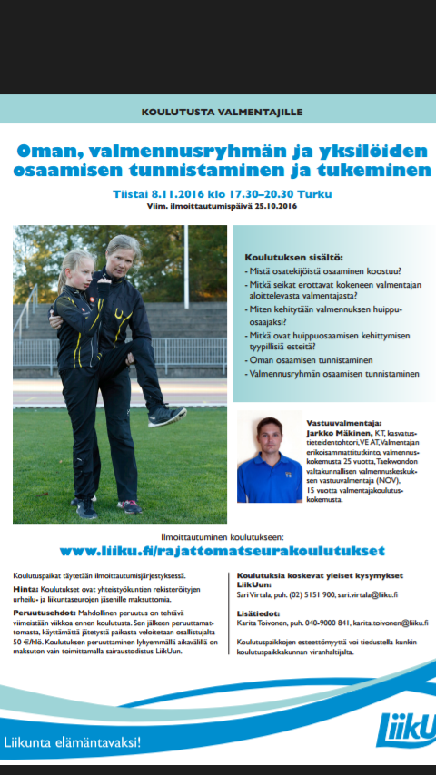 Tiistaina 8.11.2016 klo 17.30-20.30 järjestetään valmentajille suunnattu koulutus: Oman, valmennusryhmän ja yksilöiden osaamisen tunnistaminen ja tukeminen.