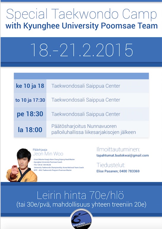 Super Poomsae helmikuun liikesarjaleiri 18.-21.2.2015 jonka päätöspäivänä kisataan myös Turku Open Poomsae.
