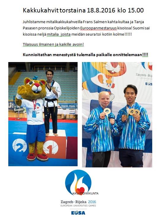 Tervetuloa Fransin ja Tanjan mitalikahville to 18.8.2016 klo 15 sekä sen jälkeen kisastudioon kannustamaan Suvi Mikkosta olympialaisissa!! HUOM. tämän päivän treeniaikataulussa on muutos!