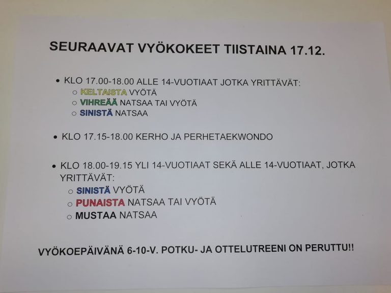 Vyökokeet järjestettiin tiistaina 16.6.2020. Hyvin on kotitreenit kevään osalta sujuneet, sillä kaikki osallistujat ansaitsivat hikisen urakan jälkeen uudet vyöarvot. Paljon onnea!! 1. kup Reza Mesbah (Rauman Taekwondo) 3. kup Kasimir Karma 4. kup Alex Karlsson Jade Helala 5. kup Otso…